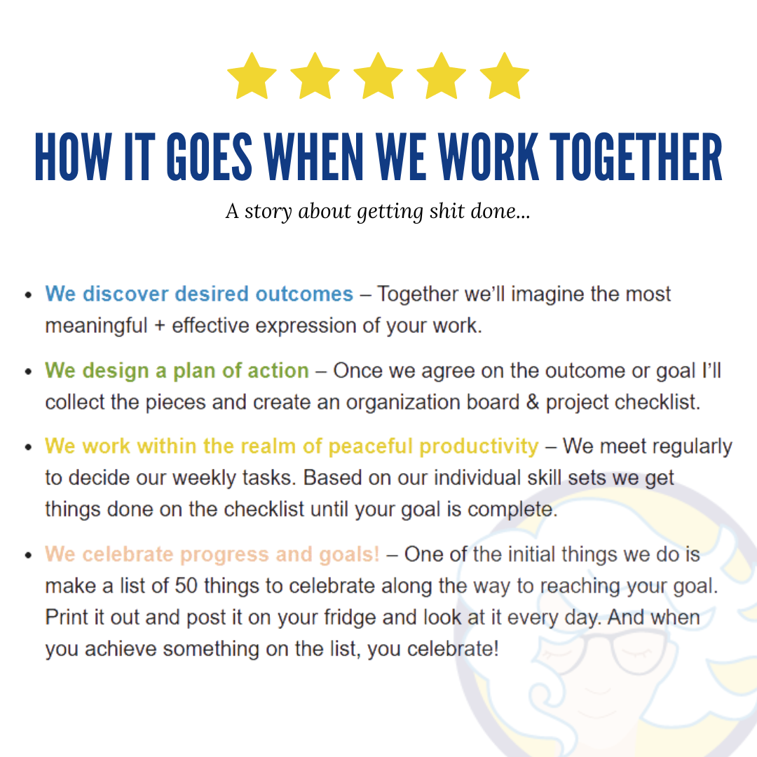 - ORGANIZATION + SYSTEMS – I help many clients by sprucing up their project management systems. I also offer a unique service called Peaceful Productivity Partnership–meeting regularly to help create holistic rhythms for work/life balance and organize thoughts/ideas/checklists to help stay on track.